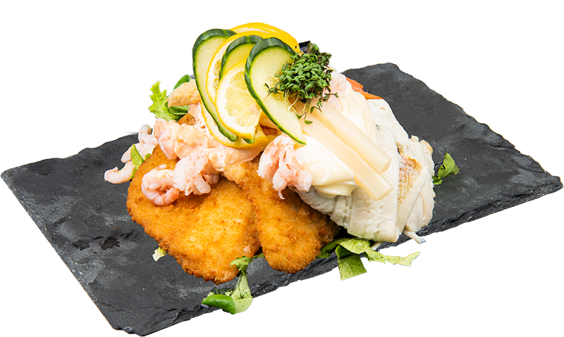 Dobbelt paneret fiskefileter med rejer, caviar og koldrøget laks og dampet fisk - pr. stk
