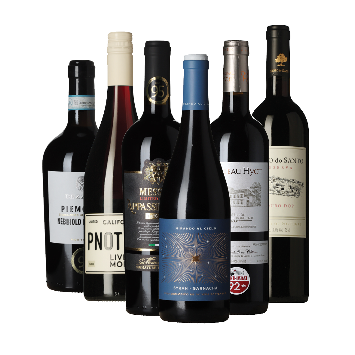Vi har lavet en kasse med røde vine fra Frankrig, Italien, Portugal, USA, Spanien.